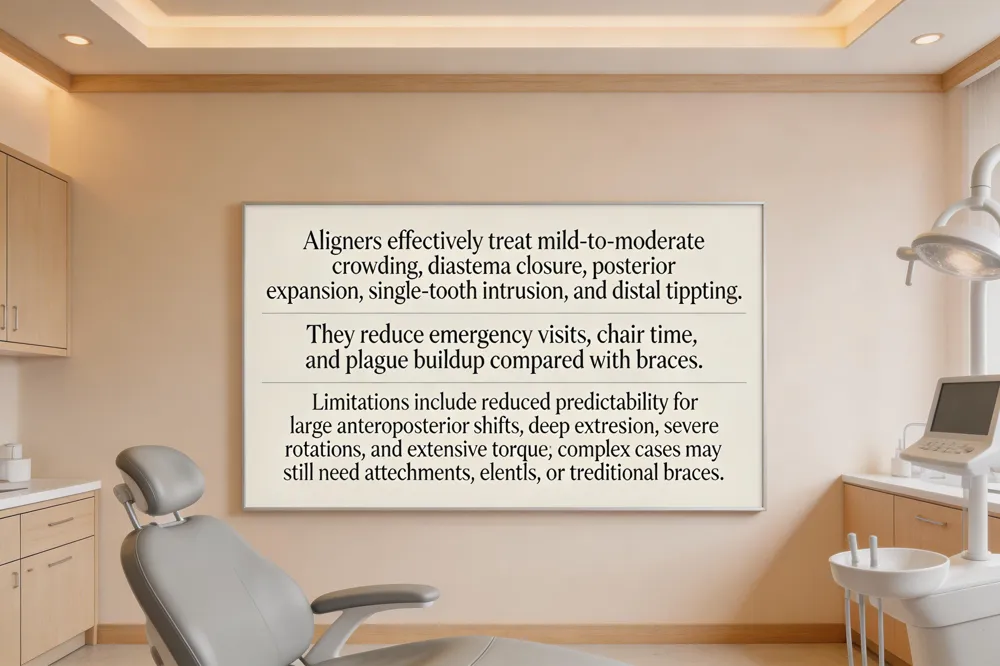 Clear aligners excel at moving teeth for mild‑to‑moderate problems such as crowding, diastema closure, posterior expansion, single‑tooth intrusion, and distal tipping of molars. Rotations of a single tooth, small bite corrections, and modest over‑ or under‑bites are also well suited, especially when attachments or elastics are used. Clinical studies show comparable space‑closure and marginal ridge alignment to fixed appliances, but aligners are less predictive for large anteroposterior shifts, deep extrusion, or extensive torque; severe rotations, molar uprighting, and large extraction‑space closures often need auxiliaries or traditional braces.
