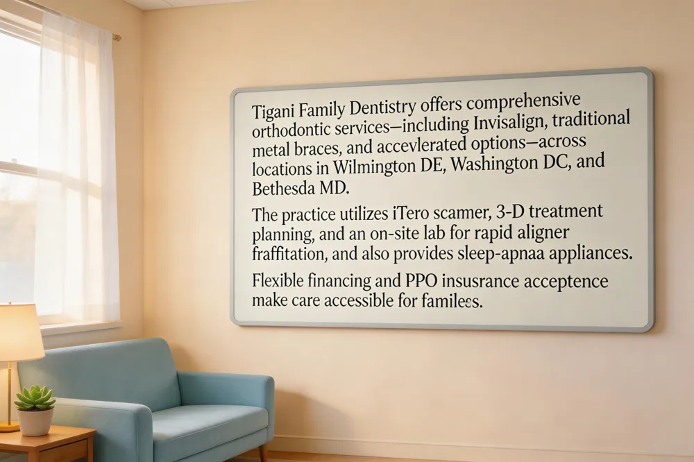 Orthodontist Wilmington DE In Wilmington, Tigani Family Dentistry provides orthodontic services using iTero digital scanners, 3‑D treatment planning, and an on‑site laboratory for rapid aligner production. Patients benefit from fewer emergency visits, removable aligners for easy oral hygiene, and flexible financing.
