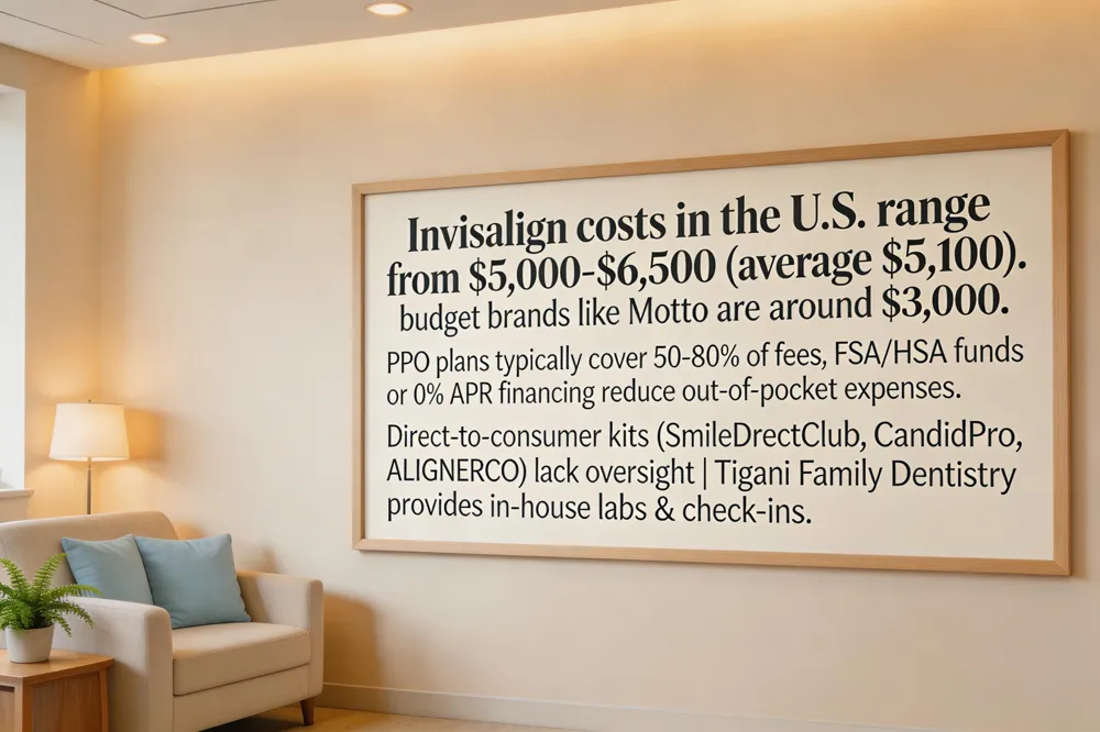 A: In the United States, clear aligners typically cost $1,800–$8,100, averaging $5,100; Invisalign averages about $6,000, while budget‑friendly options like Motto™ are around $3,000. Insurance and financing can lower out‑of‑pocket expenses.