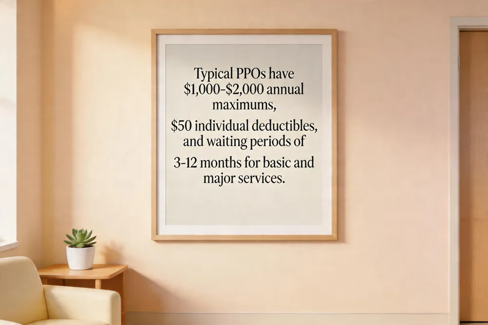 PPO plans set an annual maximum—typically $1,000–$2,000 per person (some reach $2,500+), the total insurer will pay each benefit year. A modest deductible, often $50 for individuals or $150 for families, must be met before coverage kicks in. After the deductible, coinsurance applies: preventive services 100 % (no waiting period), basic restorative work 70‑80 %, and major procedures 40‑50 % of the negotiated fee. Waiting periods are common for basic services (3 months) and major services (6–12 months), though many plans waive them after continuous coverage. To save money, stay in‑network—e.g., Tigani Family Dentistry’s PPO‑participating office—use the in‑house lab for faster, lower‑cost restorations, and schedule preventive cleanings early to avoid waiting‑period delays.