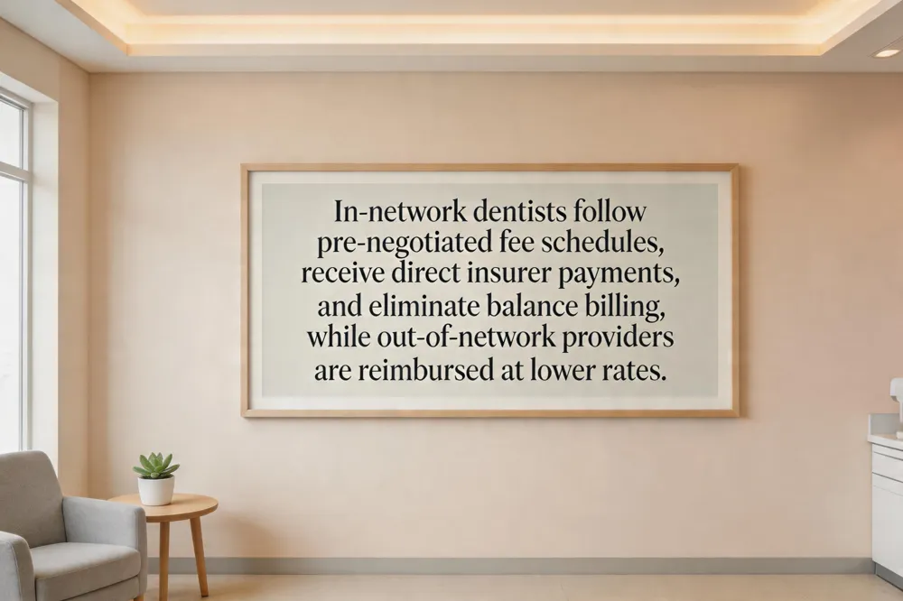 Network vs. Out‑of‑Network In‑network dentists have contracted fee schedules, eliminating balance billing and reducing out‑of‑pocket expenses. Out‑of‑network providers may be reimbursed at lower percentages, leaving patients responsible for the difference.