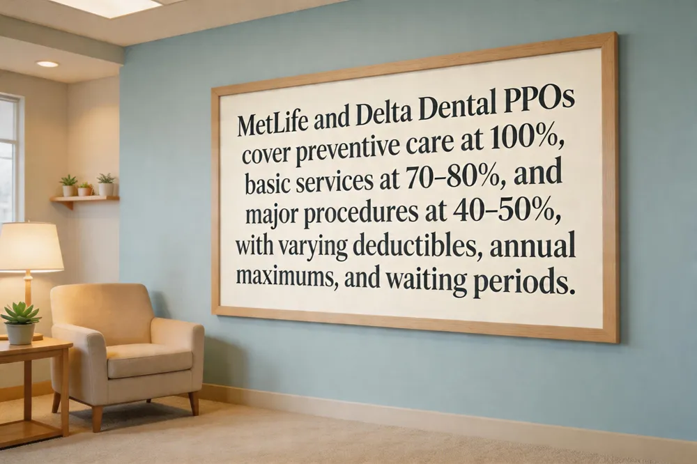 MetLife’s PPO plans cover preventive services (cleanings, exams, bite‑wing X‑rays) at 100 % with no waiting period when you stay in‑network. Basic restorative work (fillings, X‑rays) is paid at 80 % after a six‑month waiting period, while major services (crowns, bridges, dentures) receive 50 % after a twelve‑month waiting period. Orthodontics for children up to age 19 is covered only on high‑PPO options at 50 % after the waiting period. Individual deductibles are $50 (waived for preventive care) and $150 for families; the annual maximum is $1,000 per person on low‑PPO and $2,000 on high‑PPO. Out‑of‑network providers are covered at the same percentage of the allowed charge but may result in higher out‑of‑pocket costs.