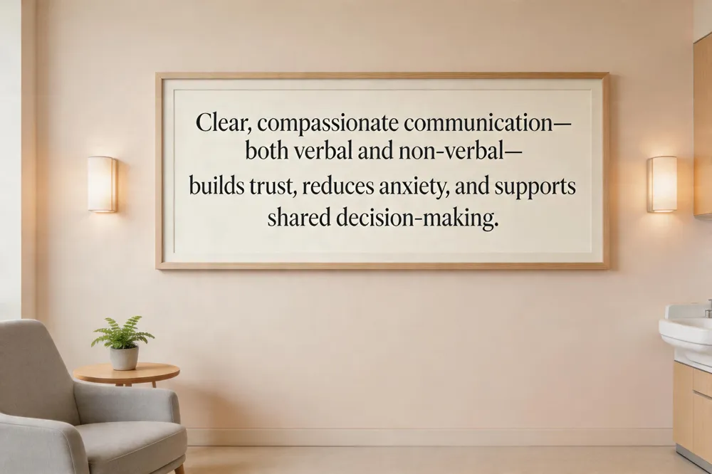 Non‑verbal cues—steady eye contact, open posture, gentle touch, and a calm tone—convey empathy and professionalism before a word is spoken. A genuine smile and attentive body language reassure patients, especially when masks limit facial cues, and create a welcoming, family‑focused environment.