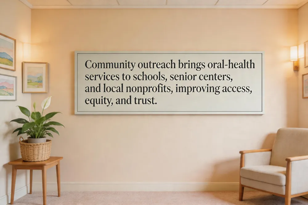 Community outreach in dentistry means extending oral‑health services beyond the clinic walls to meet patients where they live, work, and learn. By partnering with Wilmington schools, senior centers, churches, and local nonprofits, practices provide free screenings, education sessions, toothbrushes, and preventive care directly to underserved families. This approach improves access to care, promotes health equity, and builds trust by showing that the dental team cares about the community’s overall well‑being. In Wilmington, examples of outreach activities include school‑based oral‑health workshops, free senior‑center dental check‑ups, neighborhood “Smile Days” offering hygiene kits, and collaborations with local charities to fund treatment for low‑income patients.
